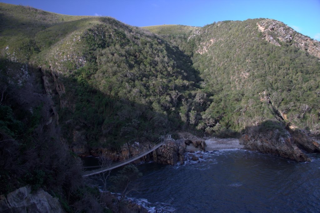Saímos de Port Elizabeth para percorrer a famosa Garden Route. Nossa primeira parada foi o Tsitsikamma National Park que se estende por 68 kilometros, possui uma floresta densa, lindas montanhas, sendo o local de encontro do rio Storms com o mar. Existem diversos locais para hospedagem, nós escolhemos chalés rústicos super aconchegantes na beira do mar. O parque é belíssimo e tem vistas panorâmicas e diversas opções de caminhadas. Fizemos a trilha de Storms River Mouth, a qual nos levou até o local do encontro entre o rio e o mar, onde pudemos admirar toda a sua beleza através das 3 pontes suspenas sobre esta foz.